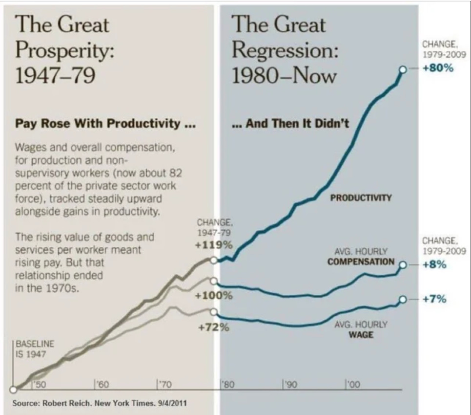 This mindset is what seeded the roots of late-stage capitalism we are currently living through: Financial deregulation in the 1980s, union busting and wage suppression, housing as investment, not shelter, healthcare as profit center, not public good. All built on the misinterpretation of their parents’ fear: